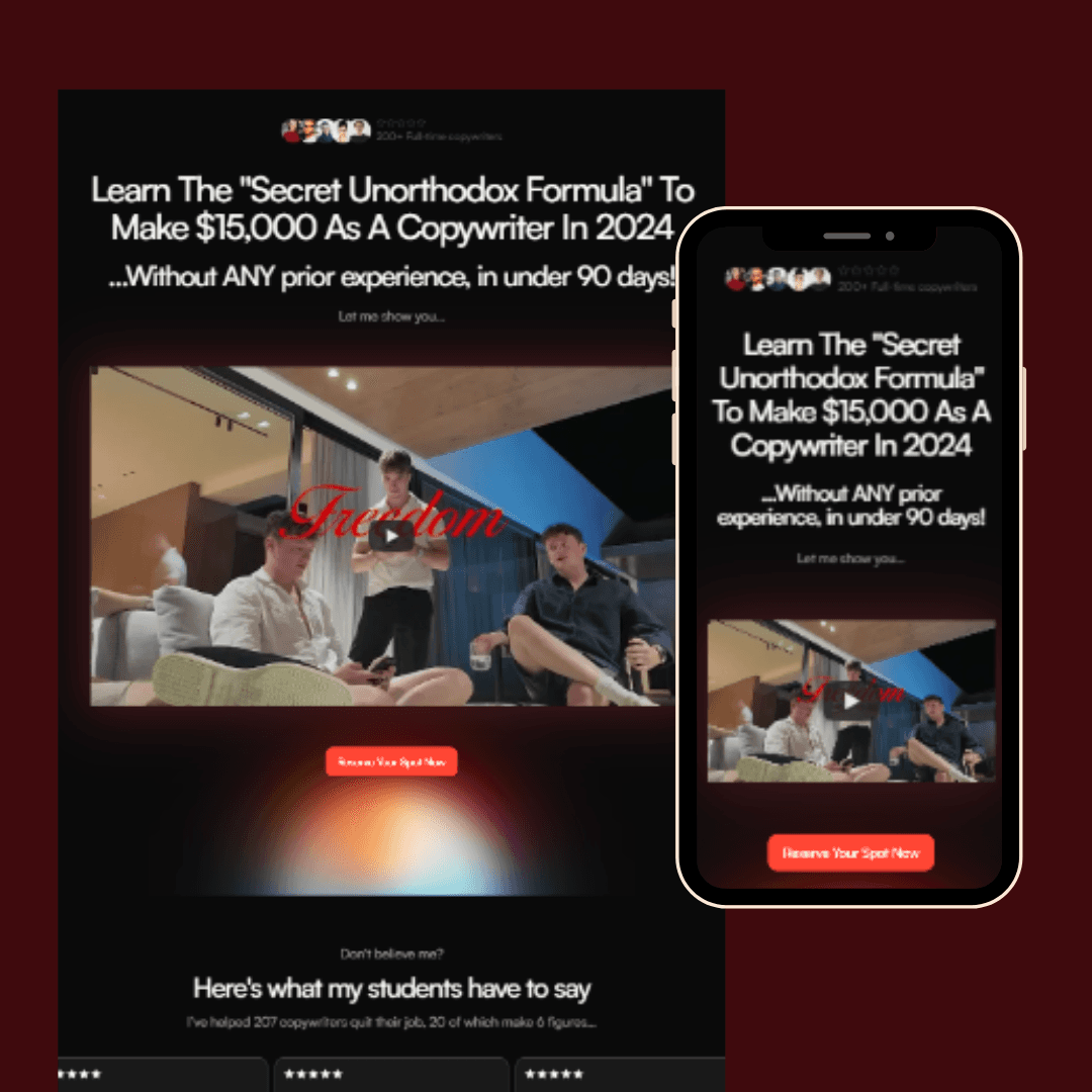 Tom Stoic works with his brother Max Stoic to help young entrepreneurs make money online with copywriting. This landing page has helped Tom gain over 430+ students within the first 2 weeks.